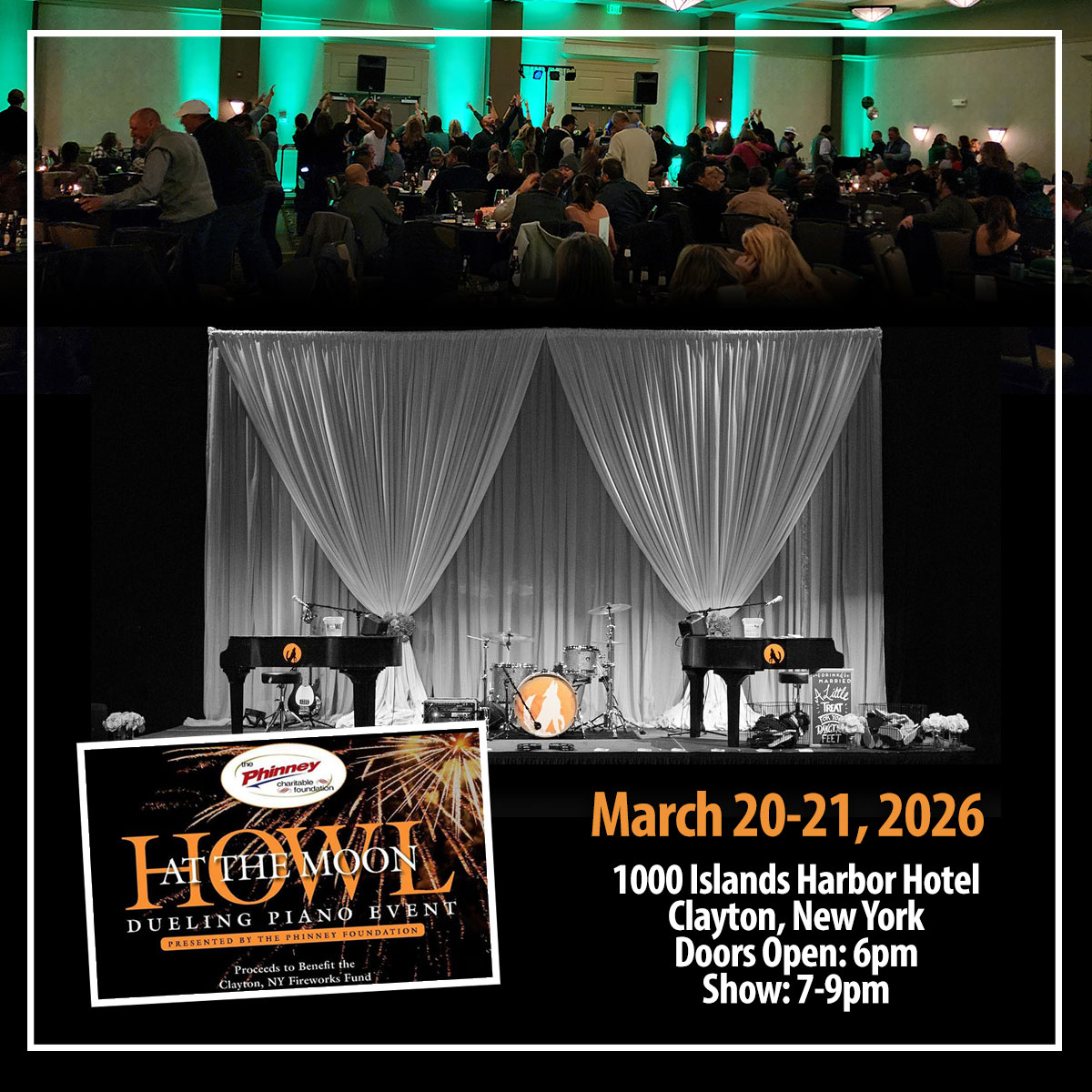 The Phinney Charitable Foundation is hosting the 8th Annual Dueling Piano Show at The 1000 Islands Harbor Hotel, proceeds to benefit The Clayton Fireworks.